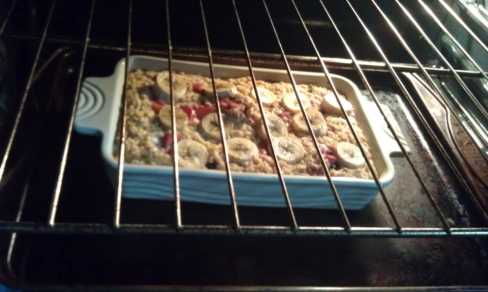 Whisk together the milk, egg, and vanilla, then pour over the oats and fruit.