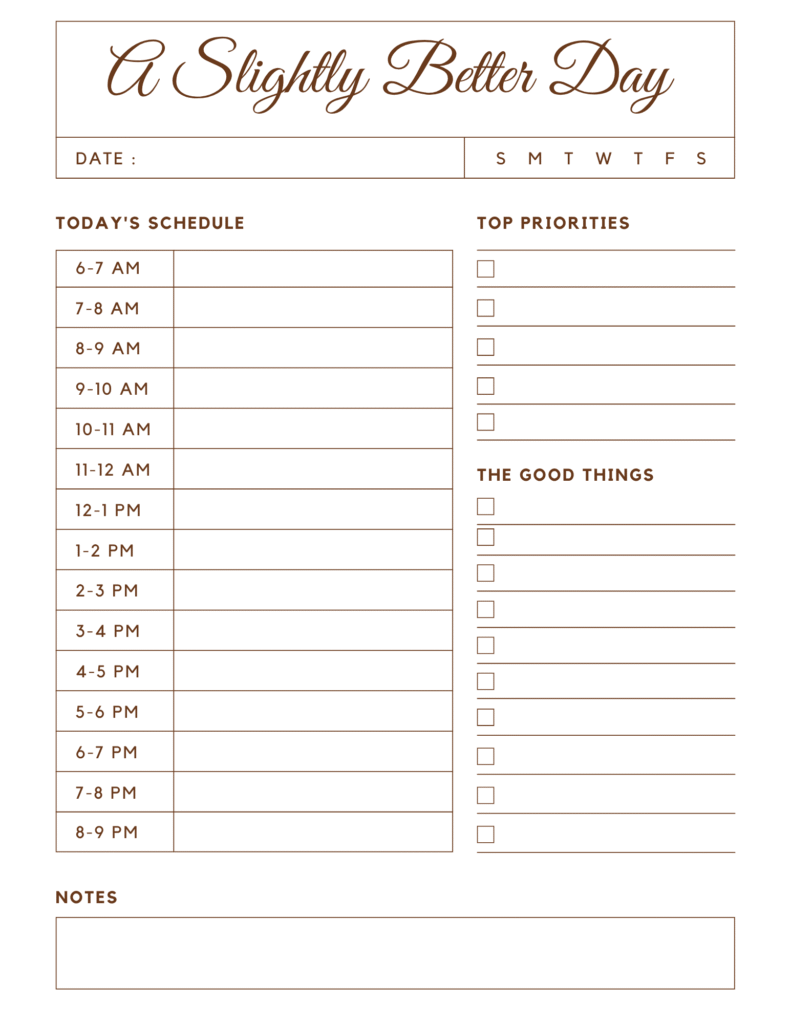 The A Slightly Better Day Printable Planner is designed to help you stay focused on what truly matters, without the overwhelm. With space to map out your schedule from 6 a.m. to 9 p.m., list your Top 5 Priorities, jot down 10 Good Things from the day, and capture any extra thoughts in the Notes section, this simple one-page layout keeps your mind clear and your heart full.